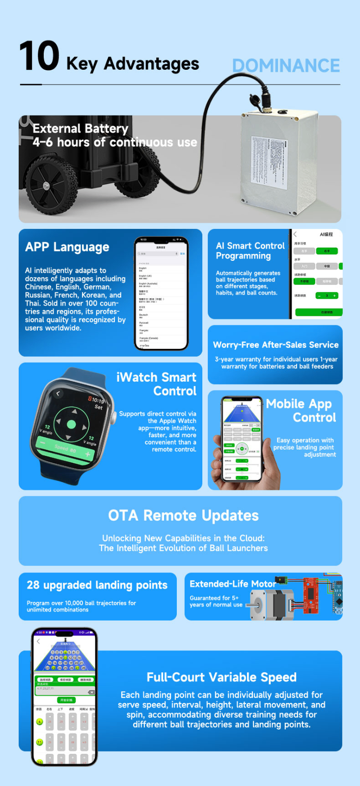 PUSUN PT-SMART PRO Intelligent Tennis Machine features a precise control system, supporting multi-speed and multi-landing spot adjustments to fit various training scenarios. Easy to operate without a partner, it’s suitable for beginners’ basic practice an