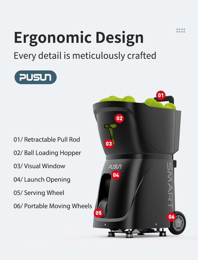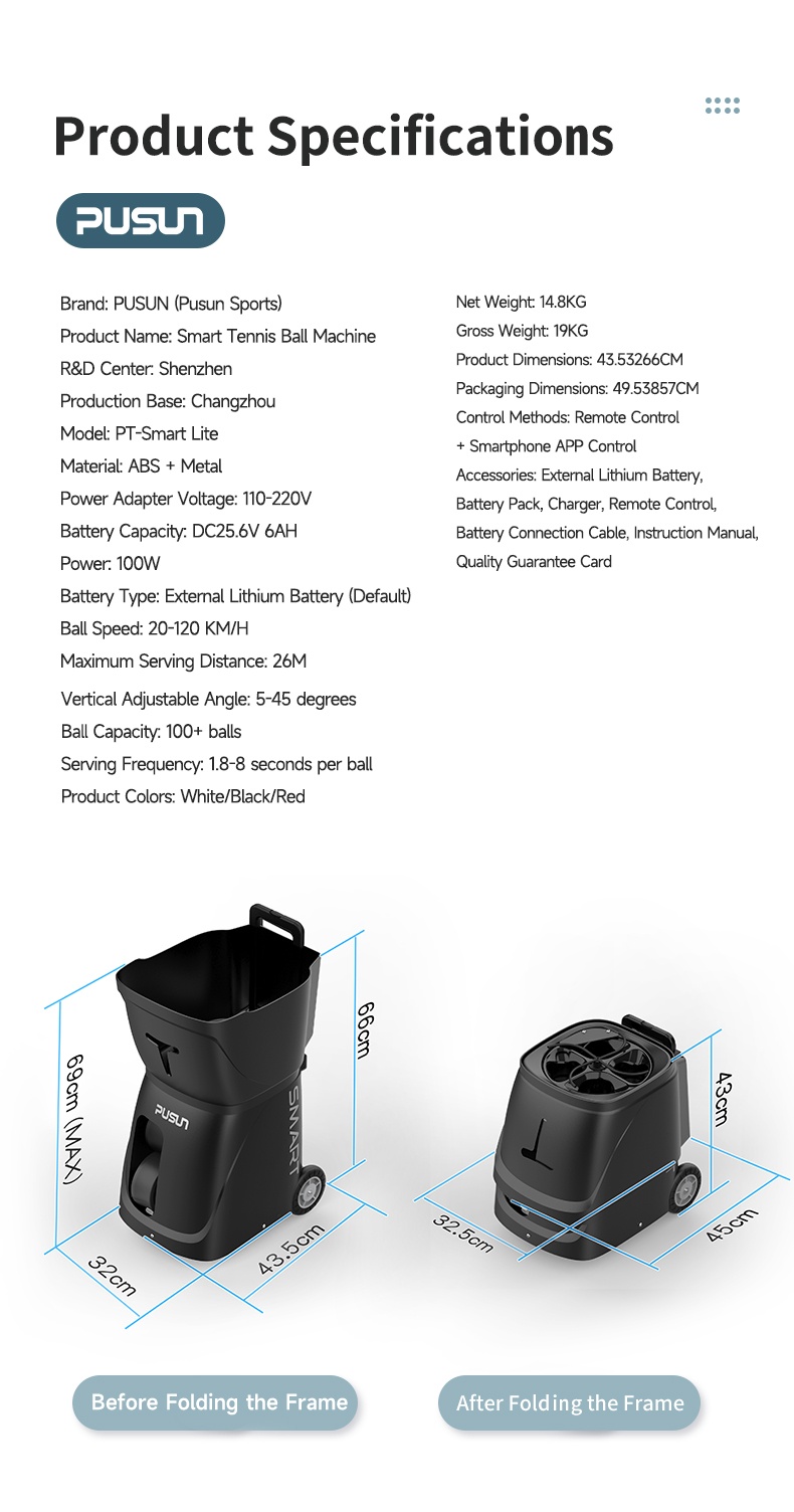 The PUSUN PT-Smart Lite is a lightweight intelligent automatic tennis ball machine. It holds over 100 balls with 20-120KM/H adjustable speed, supports 20 landing point programming and multi-serve modes. Powered by 25.6V6AH external battery for 4-6h runtime, ABS-metal body in black & white, APP full-parameter control, portable compact design ideal for solo practice and court teaching.