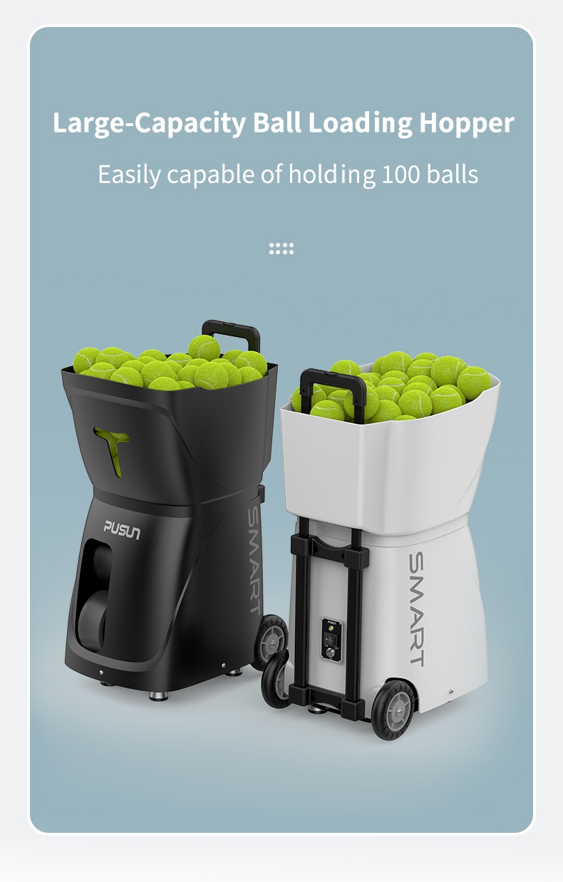 A: This PUSUN PT-Smart Lite tennis machine can store more than 100 balls for long continuous training sessions.