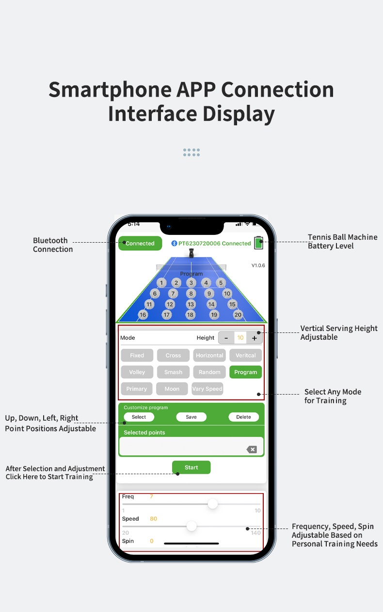 Multiple Serve Modes, 20 Landing Point Programming, Ball Path Memory, Full Parameter Adjustment, Spin Ball Serving