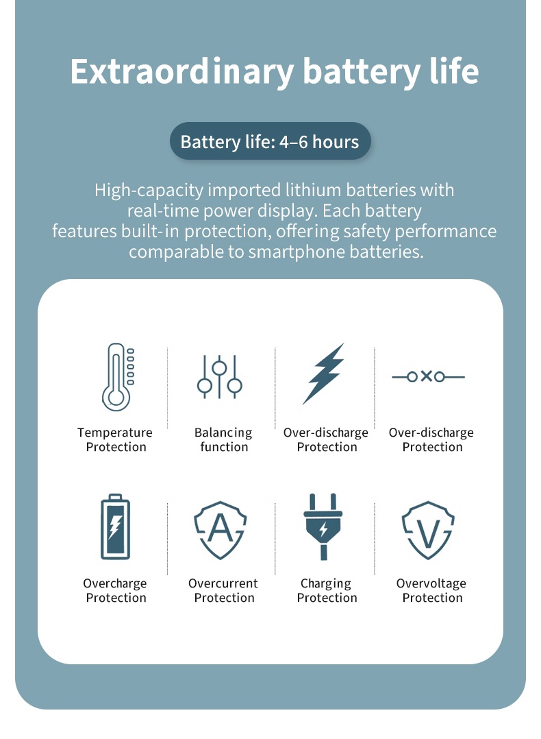 A: Equipped with 25.6V6AH external lithium battery, it delivers stable 4 to 6 hours continuous working time.