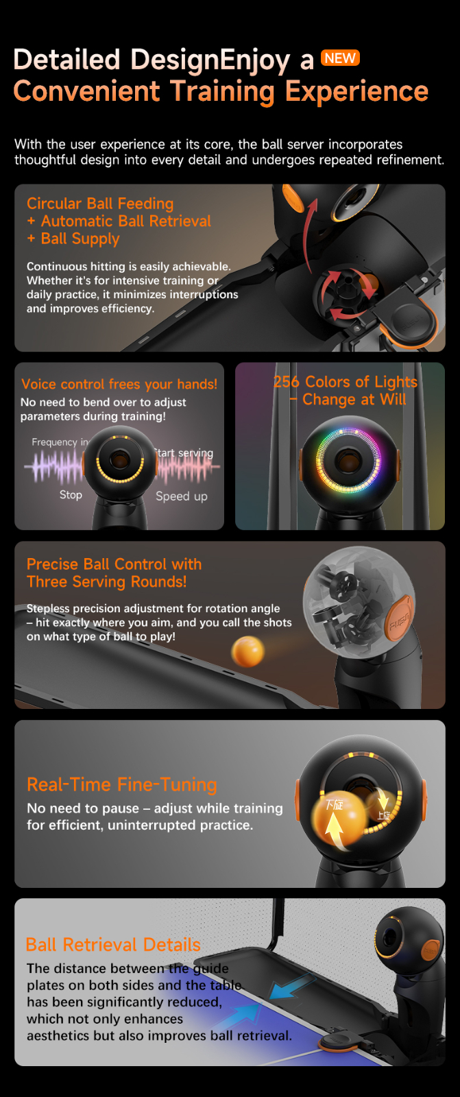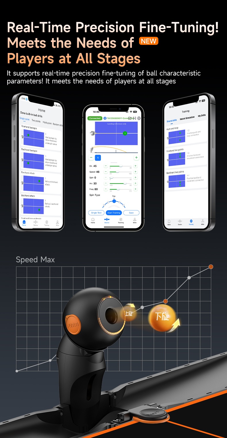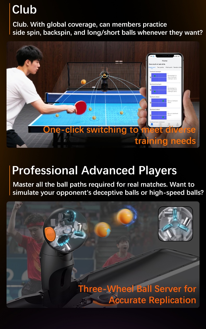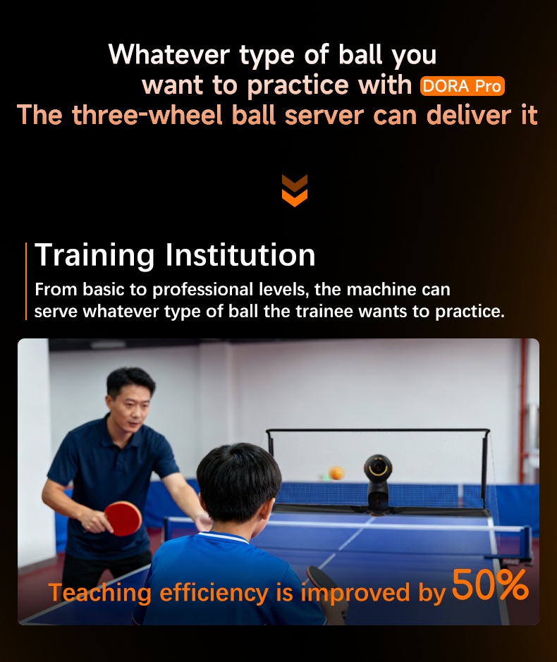 The PUSUN Dora Pro is an intelligent automatic table tennis serving robot for home training. Built with ABS and metal in black-orange color, it reaches 2-20m/s ball speed with 150+ ball capacity. 50W power, 110-220V wide voltage, full angle adjustment and complete accessories, perfectly fitting daily practice and middle school exam professional training.