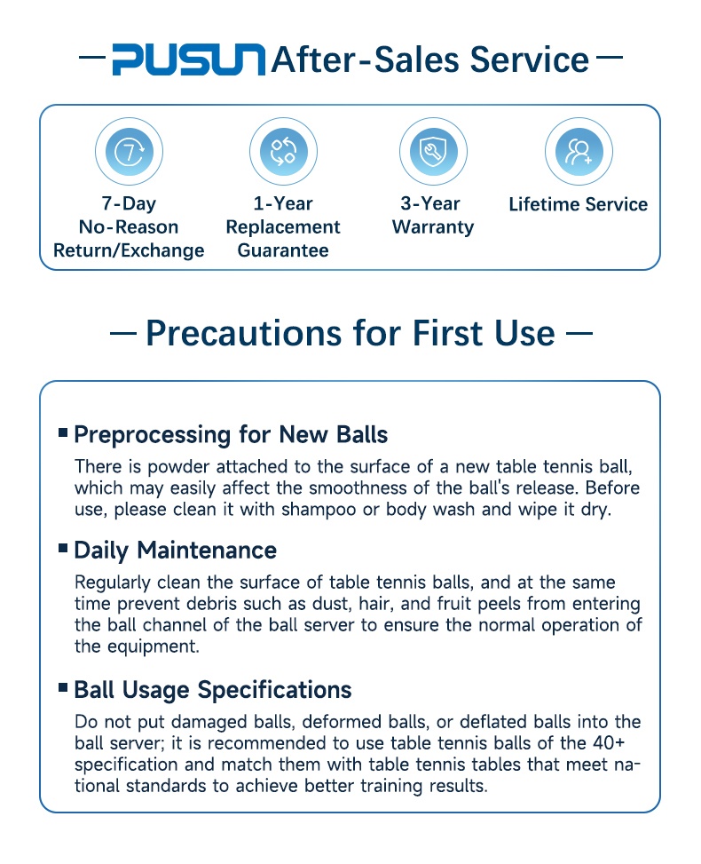 A: All PUSUN table tennis robots and tables are provided with comprehensive after-sales warranty. We will quickly handle non-artificial quality problems to fully protect your using rights.